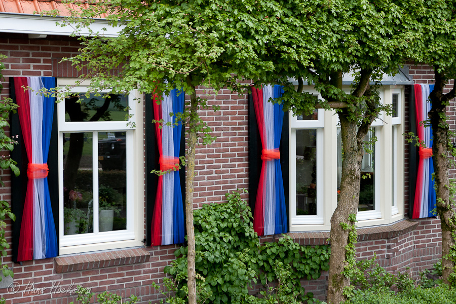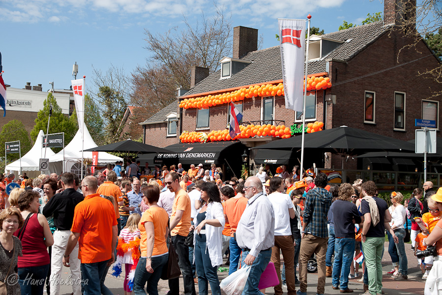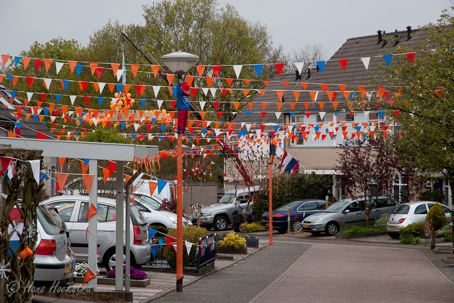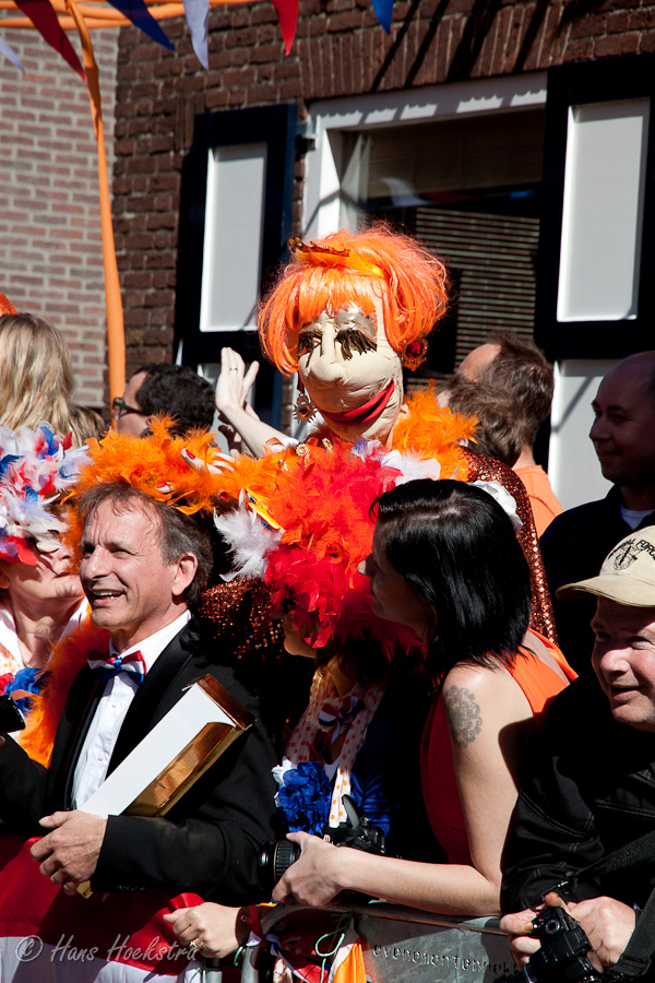 En toen was het 30 april, 5:30 uur. De eerste vrijwilligers melden zich op het gemeentehuis en ook de eerste toeschouwers zochten al een plekje. Mijn zoon mocht in het kinderkoor optreden met het welkomstlied en mijn vrouw was 1 van de begeleiders, dus zij moesten ook al vroeg aantreden. Zelf stond ik ook al om 7 uur op het door mij vooraf uitgezochte plekje (lokale kennis heeft zo zijn voordelen 😉 ). Achteraf had ik wel een uurtje later kunnen gaan, want pas na half 9 werd het echt merkbaar drukker, maar ja, het zonnetje scheen en om mij heen waren vele gezellige mensen (w.o. Johan Vlemmix), dus ik heb me niet verveeld. Interessant was ook om te zien hoe alle beveiligingsmaatregelen opgezet waren (en soms eenvoudig even opzij gezet werden toen een drumband eigenhandig besloot dat ze wel door de afzetting heen kon).