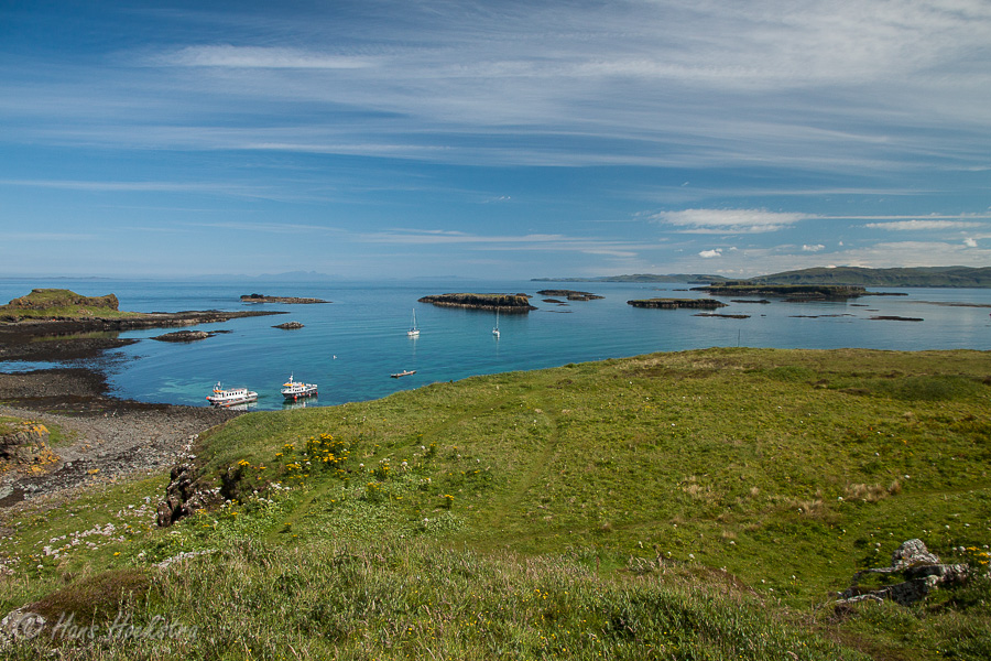 Een van de redenen waarom we naar de westkust van Schotland zijn geweest, was om een trip naar de Treshnish isles, en dan met name naar Lunga, te maken. Op Lunga is een grote kolonie Puffins (Papegaaiduikers) waar je “op visite” mag komen. De trips hiernaartoe vertrekken allemaal vanaf Mull, dus we moesten eerst met de ferry van Oban naar Mull en toen met de bus naar Tobermory waar onze boot zou vertrekken. We zouden eerst woensdag gaan, maar toen we zagen dat dinsdag een mooie zonnige dag zou gaan worden, hebben we de trip een dag kunnen verplaatsen.