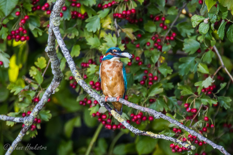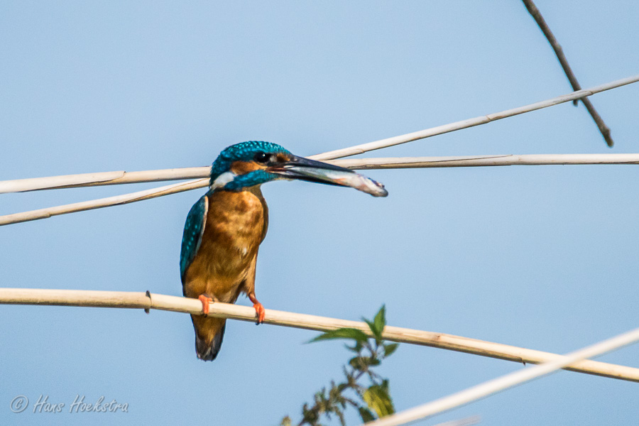 Op de rand van de gemeente Rhenen stroomt een riviertje de Grift. Hier werd deze zomer vaak een IJsvogel gezien, dus ik heb op maandagochtend daar ook een paar uur gestaan. Het leek er in eerste instantie niet op dat de IJsvogel zich liet zien, maar opeens was hij/zij er, eerst in het riet maar even later met een visje in de snavel op de takken tegenover ons.