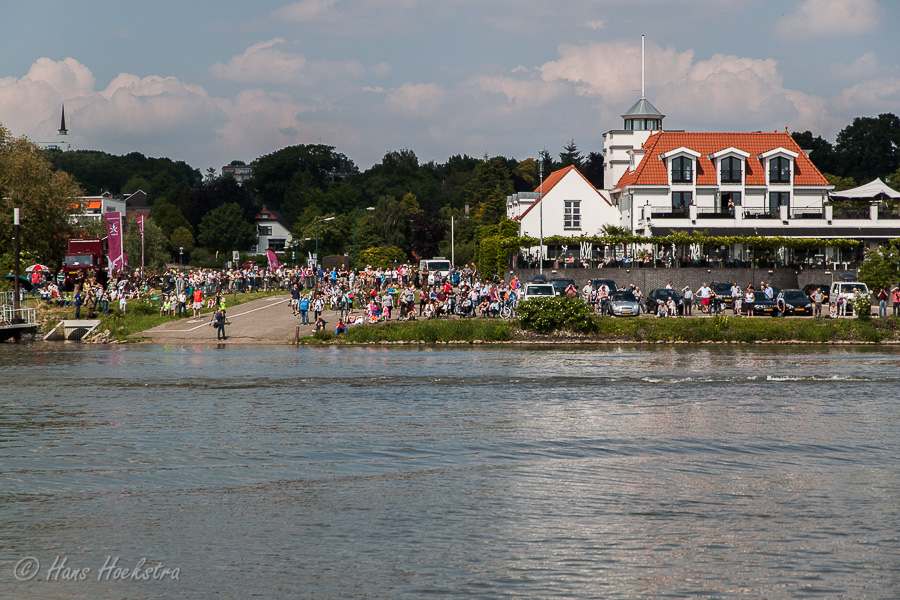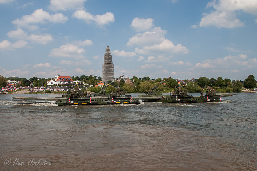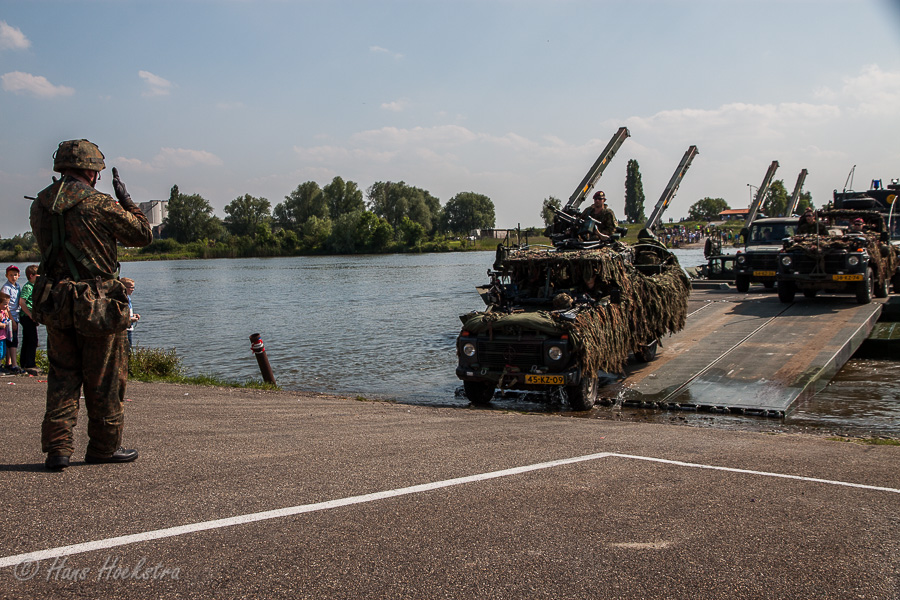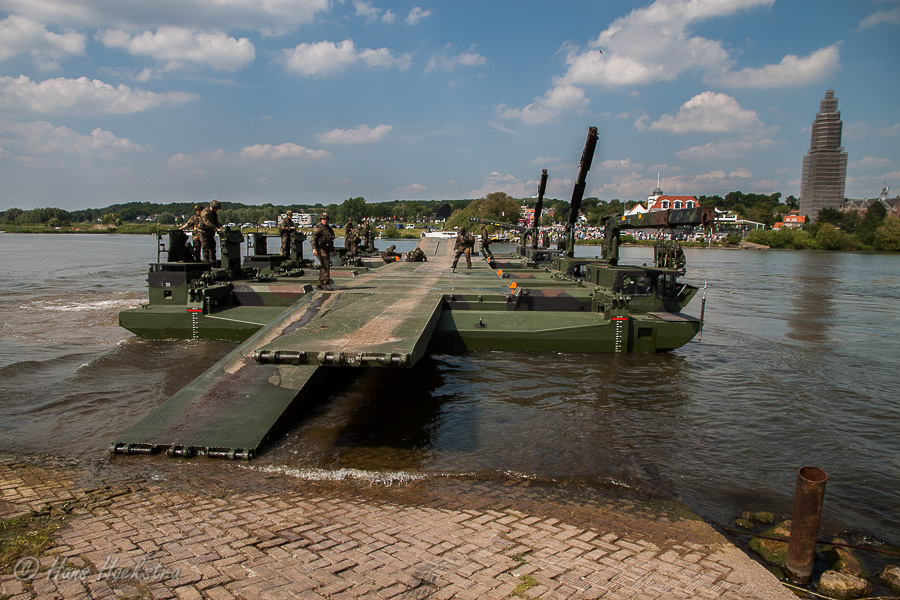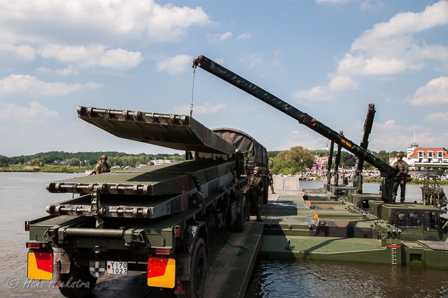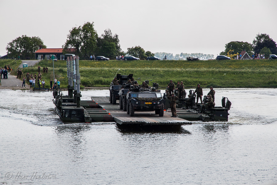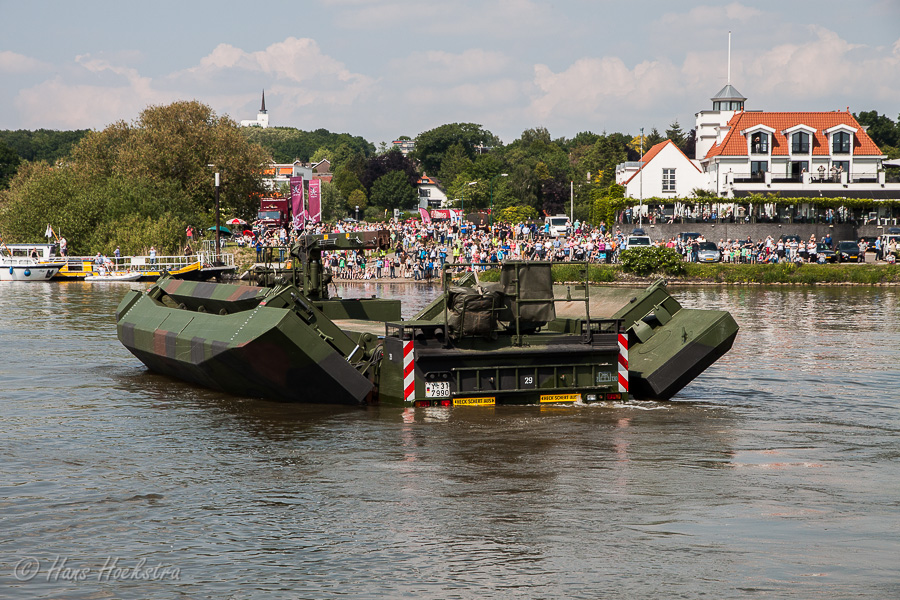 Deze oefening trok vooral aan de Rhenense kant veel bekijks, maar ook aan de Betuwse kant was genoeg publiek om het te water laten van de pontons te aanschouwen.