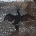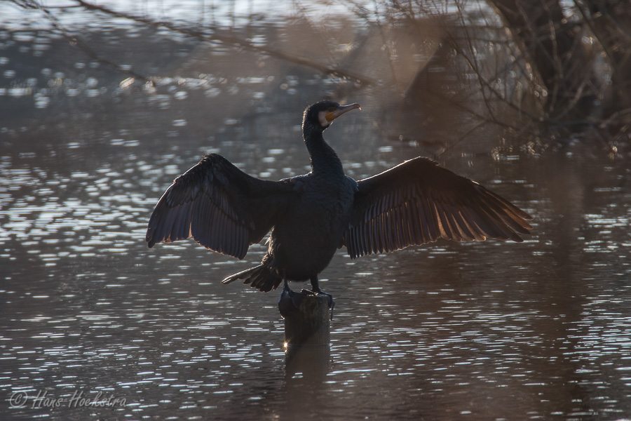 Via de nieuwe trap ben ik naar en langs de Vogelenzang vijver gelopen waar een Aalscholver zijn vleugels liet drogen in het winterzonnetje. Op de weg naar huis nog even vanaf de brug een overzicht gemaakt van nu zeer brede de Rijn met de mooie Cuneratoren op de achtergrond.