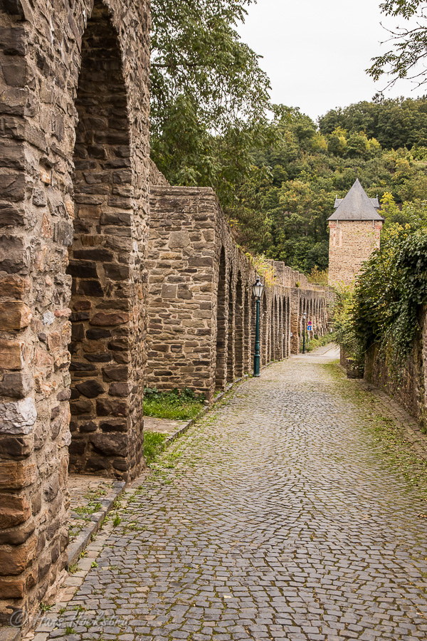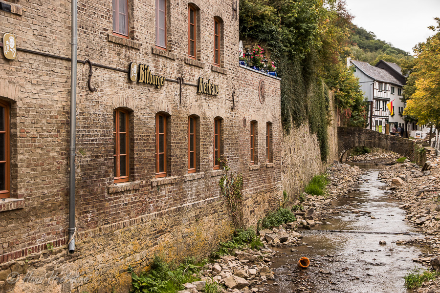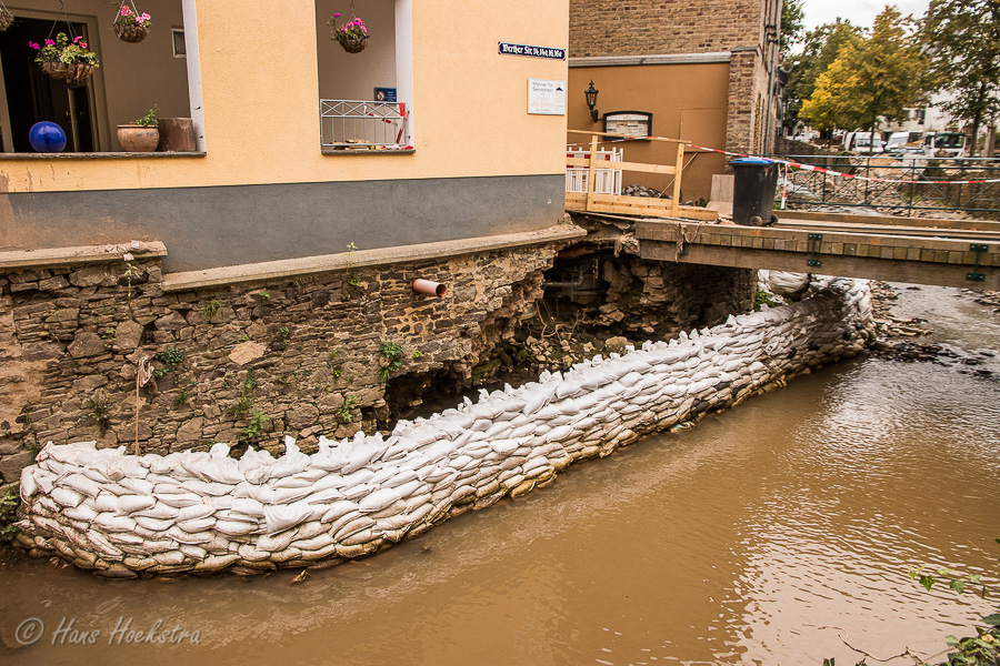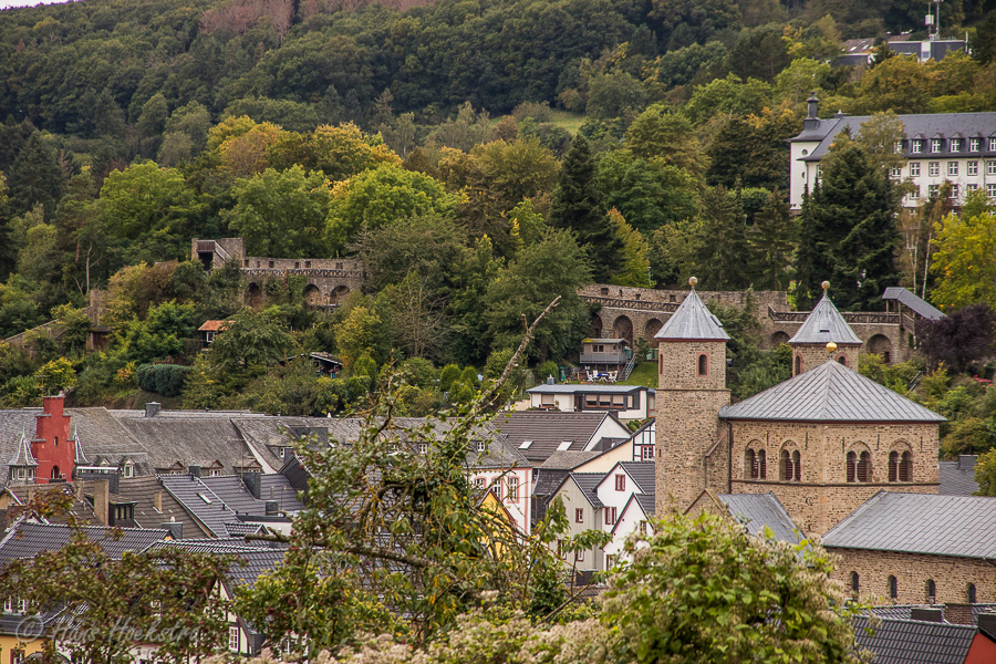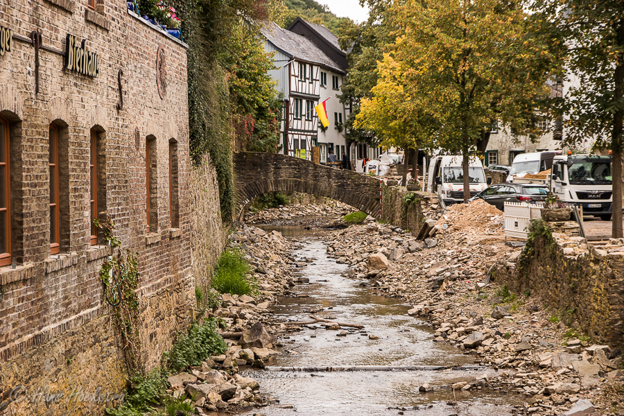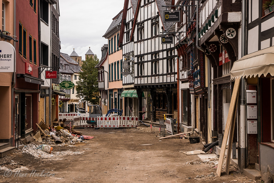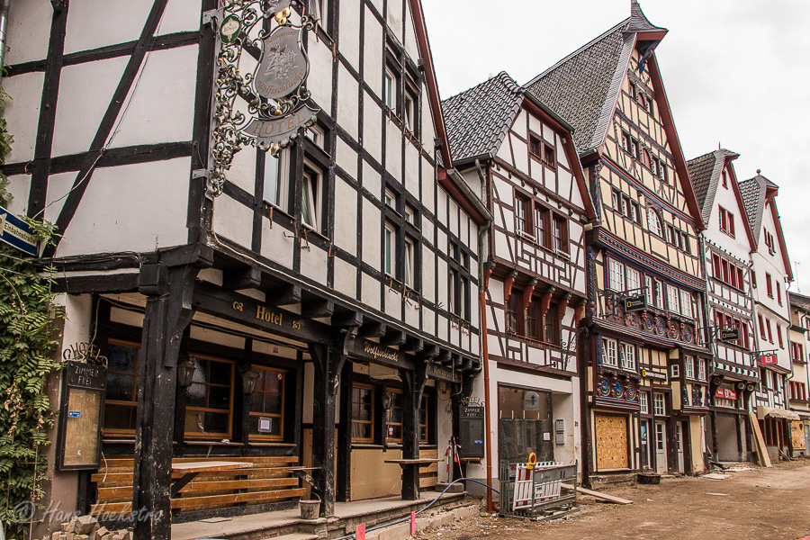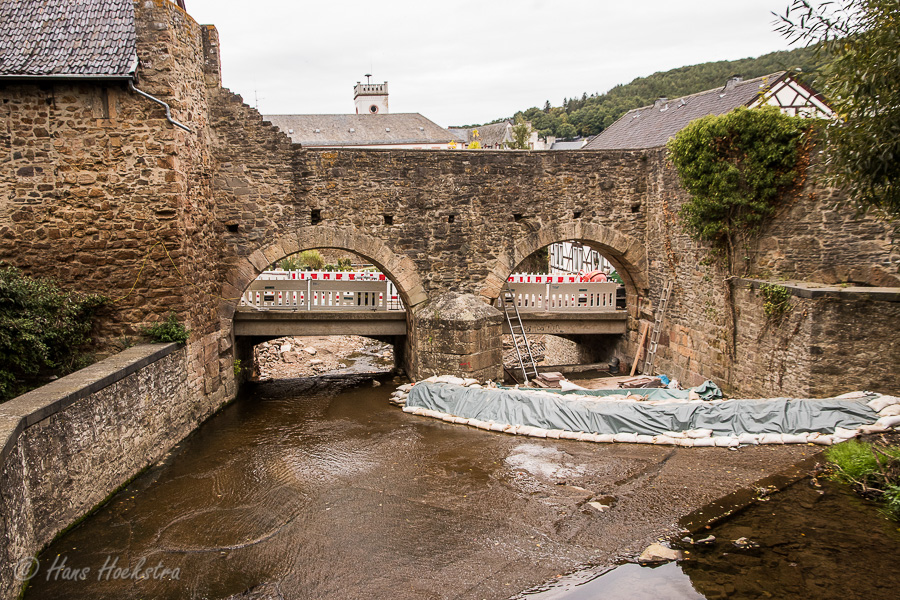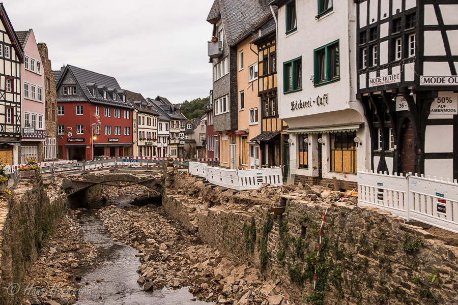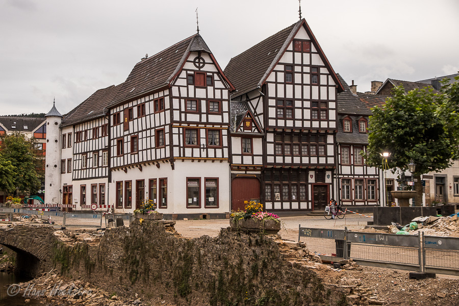 Bad Munstereifel is een middeleeuwse stadje met mooie gebouwen en een vele outlet winkels. Helaas is het zwaar getroffen door de overstromingen in juli. Omdat de rivier de Erft door de binnenstad stroomt, zijn alle winkels aan weerszijden van de rivier verwoest. Toen wij er in september waren, werd er nog steeds hard gewerkt aan het drogen en het herstellen van de schade. Omdat het veelal vakwerkhuizen zijn, is de schade groot omdat deze gebouwen niet gebouwd zijn van steen, maar van houten balken, opgevuld met vlechtwerk en leem.