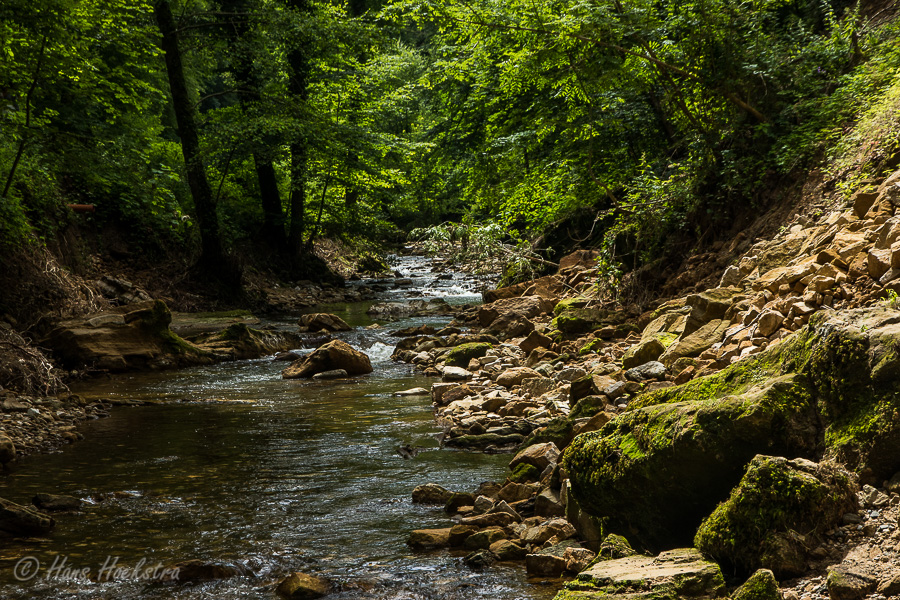 Daarna zijn we doorgereden naar Mullerthal om daar naar de bekendste waterval Scheissentumpel te lopen. Door de wateroverlast van een paar weken eerder was het wandelpad langs de rivier beschadigd en dus afgesloten en moesten we langs de weg naar de waterval lopen. Ook langs de weg was een deel van de oever beschadigd. Je zag die waterschade wel meer, zeker op campings langs riviertjes en zelfs in Vianden.
