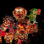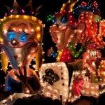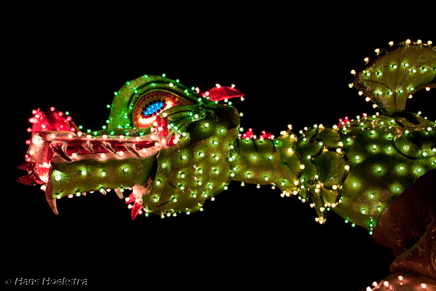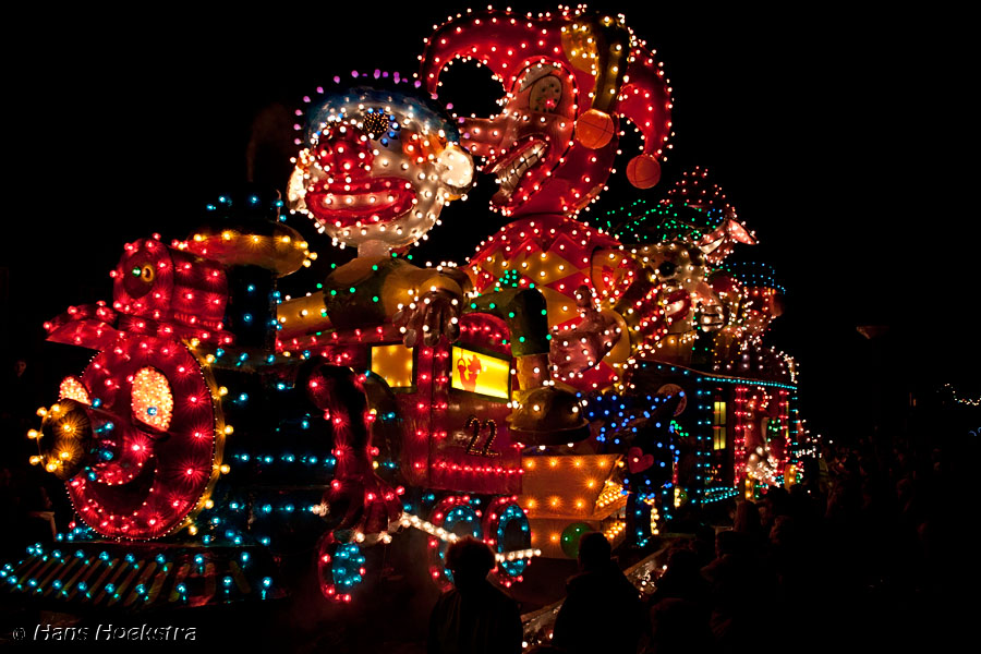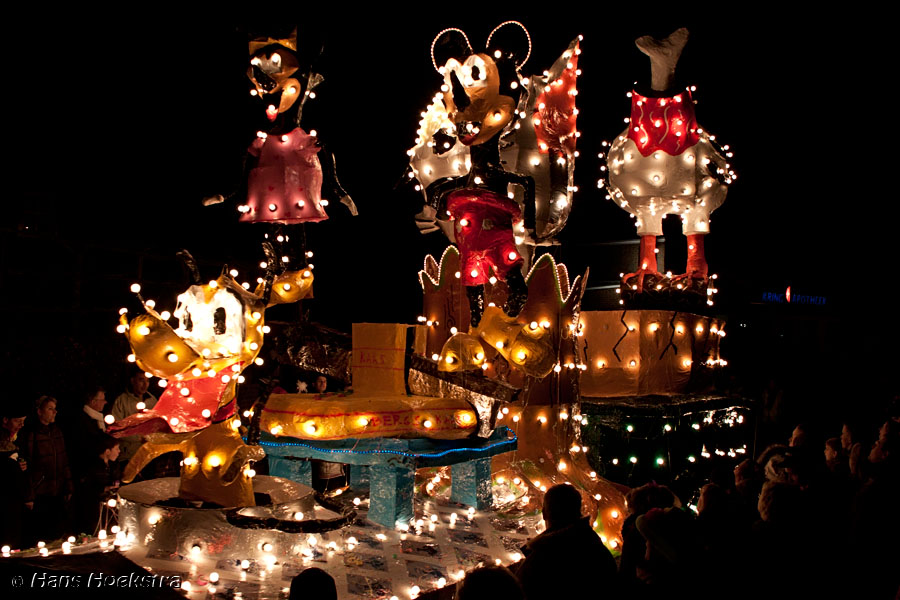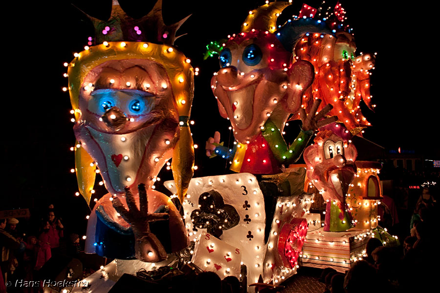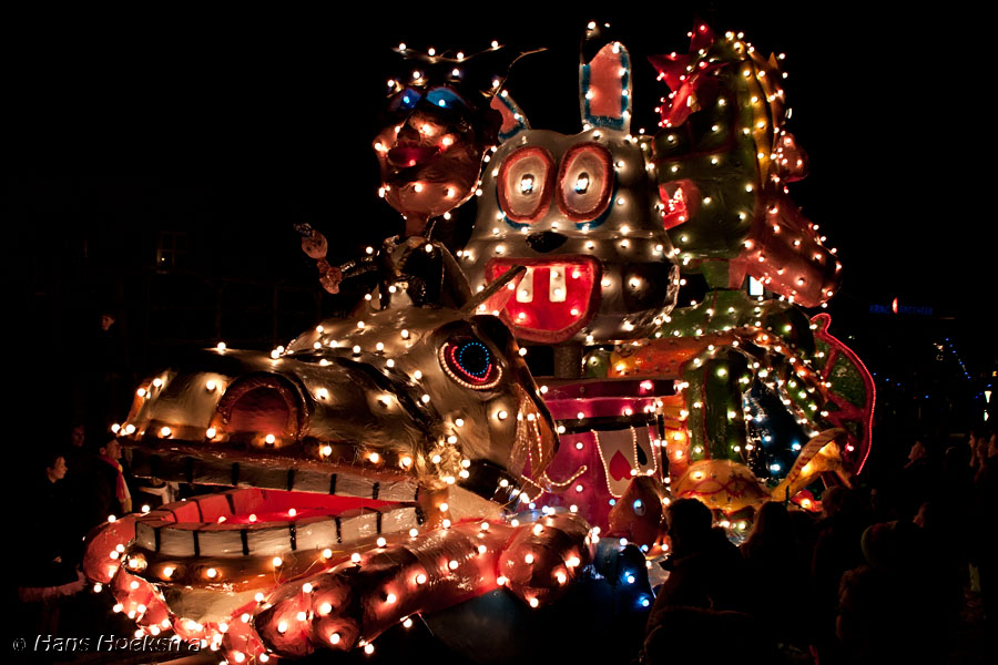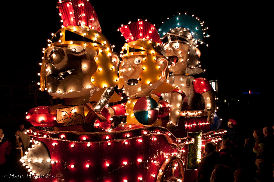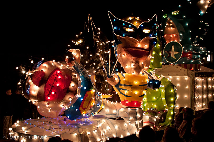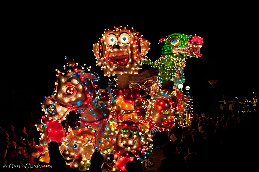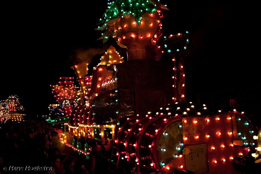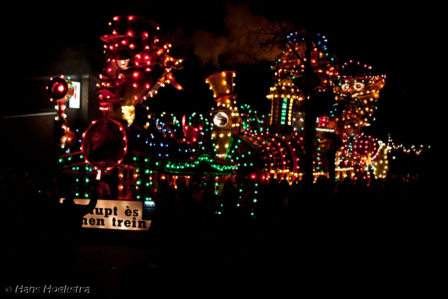 Vanaf 19 uur werd het startschot gegeven (met wat vuurwerk). We moesten toch nog zo’n 20 minuten wachten voordat de eerste wagens in zicht kwamen. De ene nog mooier en groter dan de andere. Helaas waren er 2 die last van stroomstoring hadden (net als het iets verderop gelegen Oss). Het duurde 2 uur voordat de stoet van 38 groepen voorbij was langs te lopen.
