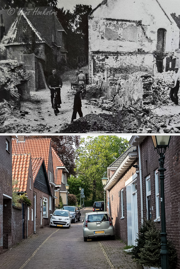 In 1980 werd het boek “Gebroken lente, Rhenen 1940-1945”, samengesteld door J.G. Koekoek en Dr. H.P Deys, gepubliceerd. Hierin staan 250 foto’s uit die 5 roerige oorlogsjaren. Daar doorheen bladerend werd ik nieuwsgierig naar wat er na 75 jaar in het huidige Rhenen nog terug te vinden is van de situatie geschetst op die foto’s. De binnenstad is toen grotendeels onherkenbaar beschadigd, maar verrassend genoeg, mits je goed kijkt, staan er nu nog steeds gebouwen uit die periode die min of meer onbeschadigd zijn gebleven of zelfs herbouwd zijn.