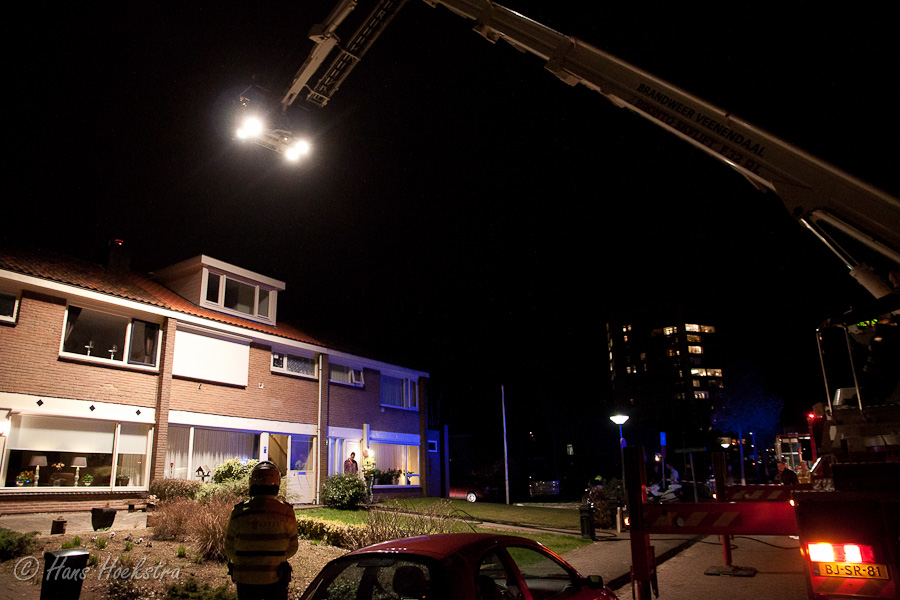 Even later kwam de hoogwerker ook ter plaatse en kon een brandweerman de brandende schoorsteenkap verwijderen en de brand van bovenaf blussen.