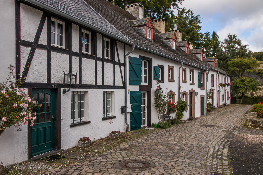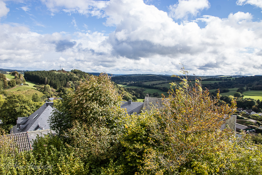 Monschau is een mooi stadje dat de bovenloop van de rivier de Ruhr ligt tussen de heuvels. Enkele jaren geleden waren we hier ook al eens geweest op de kerstmarkt. Nu wilden we het eens bij daglicht bekijken en was het een stuk rustiger, al liepen er nog genoeg toeristen. Gelukkig had Monschau weinig zichtbare schade door de overstromingen in juli, wat in sommige andere plaatsen wel anders was. Zo was bijvoorbeeld een grote parkeerplaats bij het bezoekerscentrum Vogelsang gebruikt als opslagterrein voor alle puin uit de omliggende plaatsen.